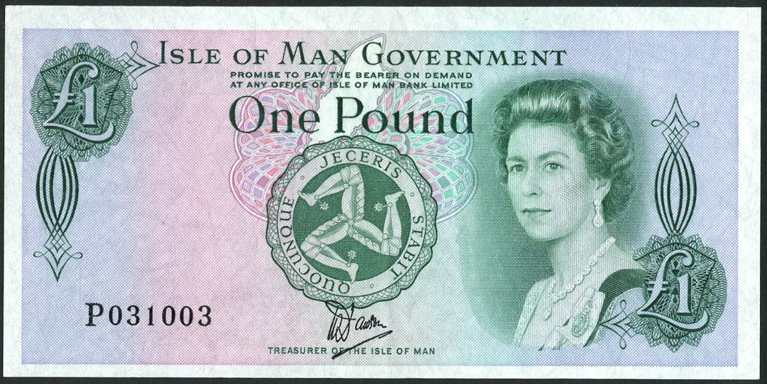 Isle of Man Government, £1 (6) printed on bradvek polymer, ND (1985-87), serial numbers N 667076, P 031003/04, P 145867, P 189987, P 244969, signature Dawson, green and multicoloured, portrait of Queen Elizabeth II by Anthony Buckley at right, triskeles at centre, reverse St. John's Church on Tynwald Hill