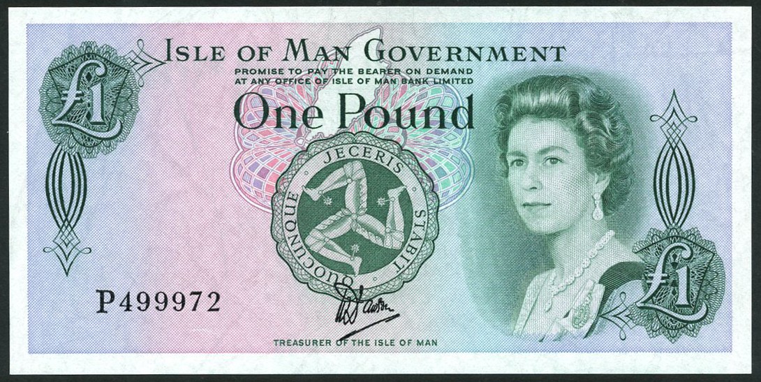 Isle of Man Government, £1 (2) printed on bradvek polymer, ND (1987), serial numbers P 499972, P 499982, signature Dawson, green and multicoloured, portrait of Queen Elizabeth II by Anthony Buckley at right, triskeles at centre, reverse St. John's Church on Tynwald Hill