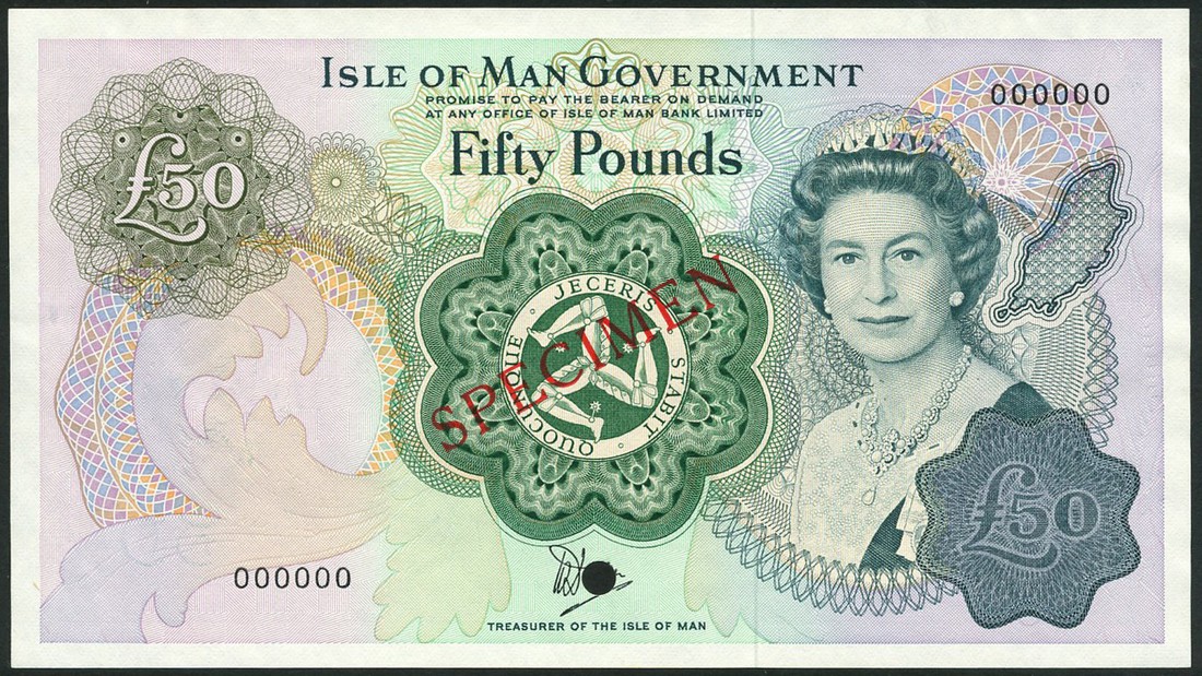 Isle of Man Government, specimen £50, ND (1983), serial number 000000, signature Dawson, green and multicoloured, silver jubilee portrait of Queen Elizabeth II by Peter Grugeon at right, triskeles at centre, reverse view of Douglas Bay, overprinted SPECIMEN diagonally in red on obverse and reverse, one punch hole