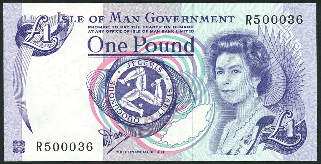 Isle of Man Government, £1 (3), ND (1990), serial numbers R500036, R500042, R565051, signature Dawson, purple and multicoloured, portrait of Queen Elizabeth II by Anthony Buckley at right, triskeles at centre, reverse St. John's Church on Tynwald Hill