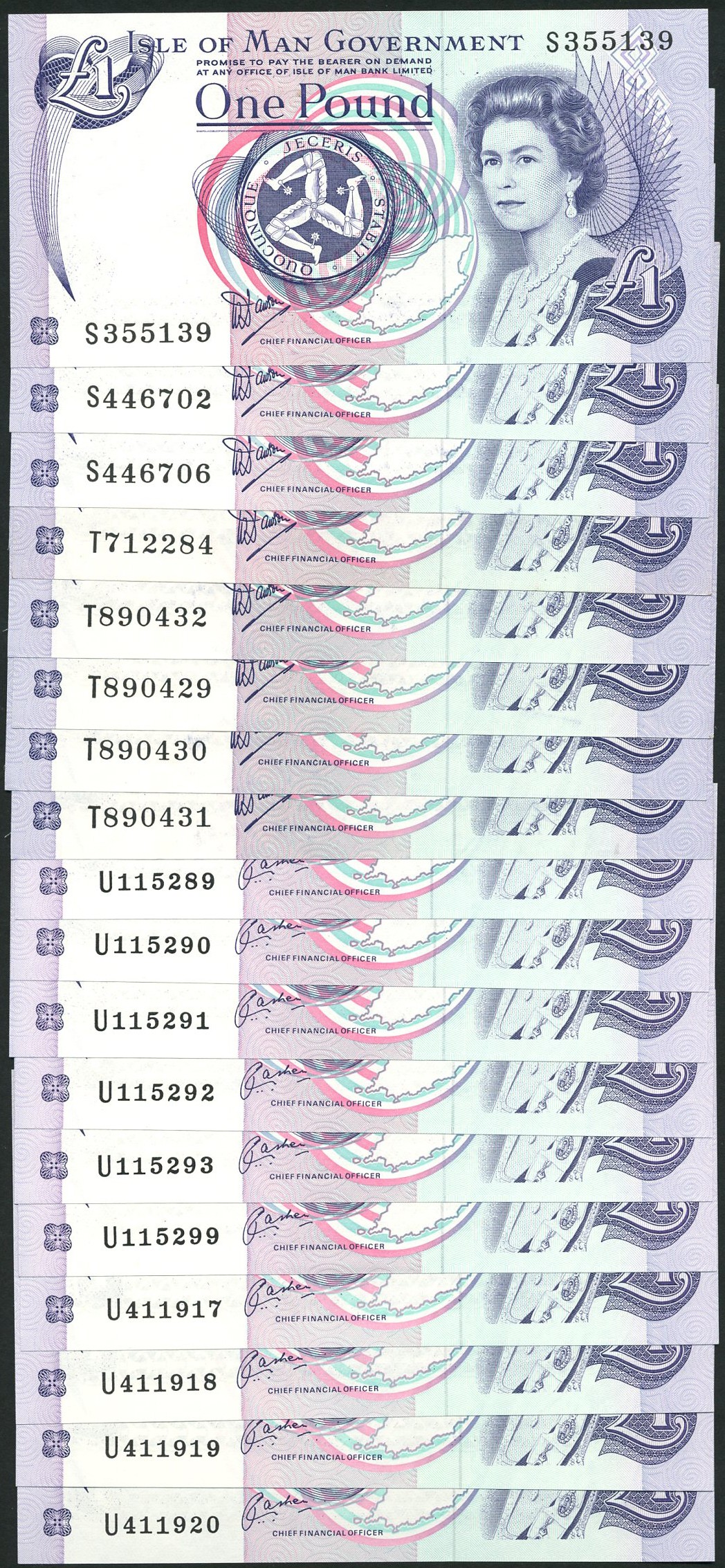 Isle of Man Government, £1 (8), ND (1990), prefixes S (3), T (5), signature Dawson, £1 (10), ND (1992), signature Cashen, prefix U (10), purple and multicoloured, portrait of Queen Elizabeth II by Anthony Buckley at right, triskeles at centre, reverse St. John's Church on Tynwald Hill