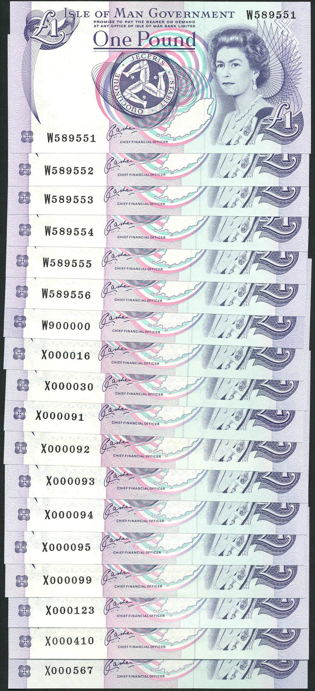 Isle of Man Government, £1 (18), ND (1992-2008), serial numbers W589551/52/53/54/55/56, W900000, X000016, X000030, X000091/92/93/94/95, X000099, X000123, X000410, X000567, signature Cashen, purple and multicoloured, portrait of Queen Elizabeth II by Anthony Buckley at right, triskeles at centre, reverse St. John's Church on Tynwald Hill