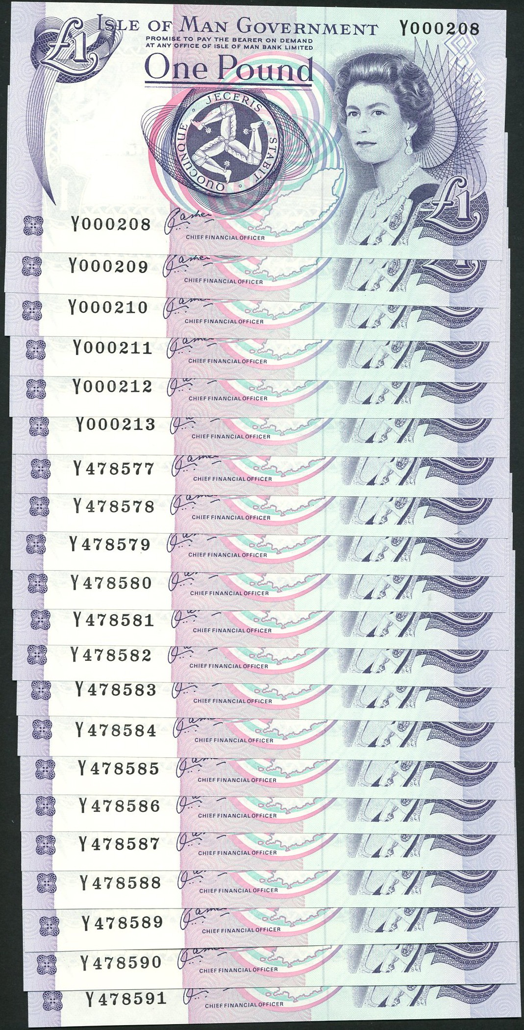 Isle of Man Government, £1 (21), ND (1992-2008), serial numbers Y000208/09/10/11/12/13 and Y478577 to Y478591 inclusive, signature Cashen, purple and multicoloured, portrait of Queen Elizabeth II by Anthony Buckley at right, triskeles at centre, reverse St. John's Church on Tynwald Hill