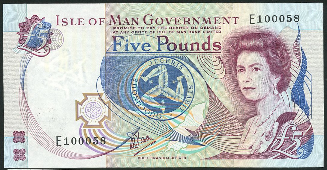 Isle of Man Government, £5 (4), ND (1987), serial numbers E100058, E290438, E259339, E638982, signature Dawson, purple, blue, green and multicoloured, portrait of Queen Elizabeth II by Anthony Buckley at right, triskeles at centre, reverse Castle Rushen