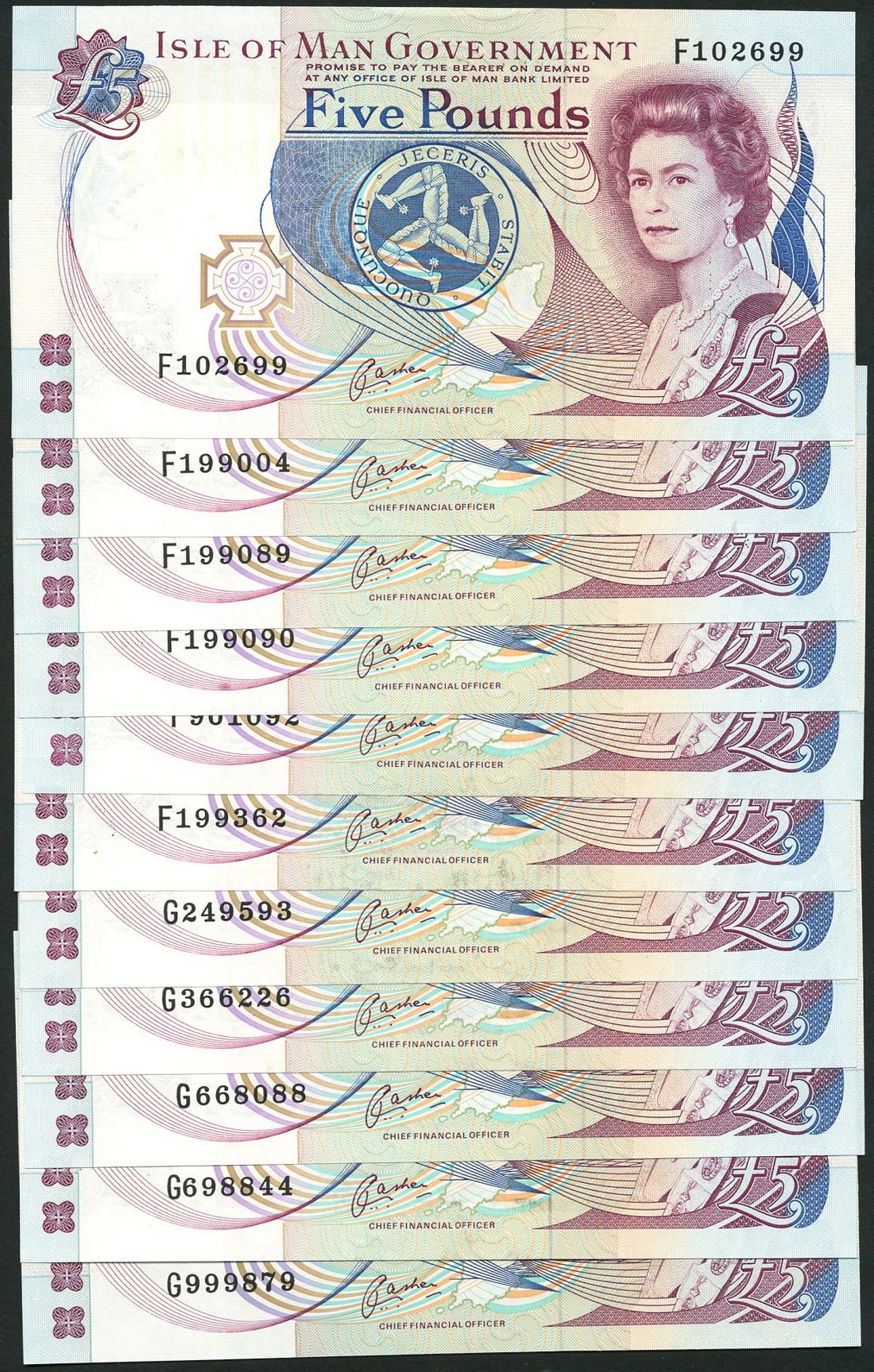 Isle of Man Government, £5 (12), ND (1991-95), prefixes F (7), G (5), signature Cashen, purple, blue, green and multicoloured, portrait of Queen Elizabeth II by Anthony Buckley at right, triskeles at centre, reverse Castle Rushen