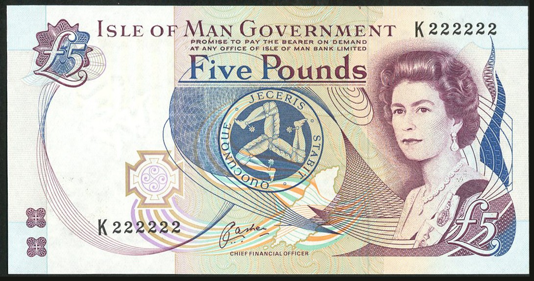 Isle of Man Government, £5 (5), ND (1996-2001), serial numbers K222222, H444444, H500000, J400000, J900000, signature Cashen, purple, blue, green and multicoloured, portrait of Queen Elizabeth II by Anthony Buckley at right, triskeles at centre, reverse Castle Rushen