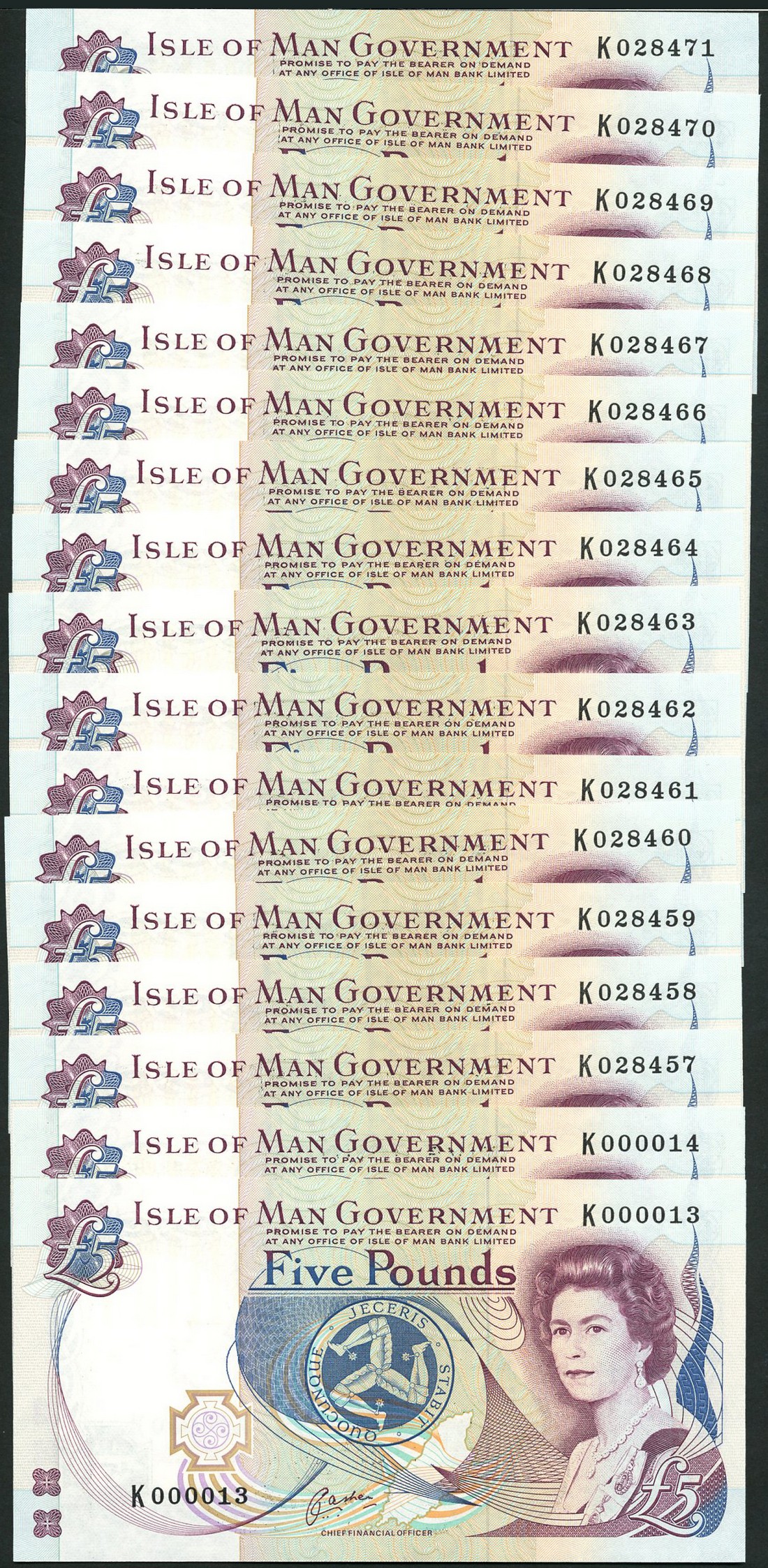 Isle of Man Government, £5 (17), ND (1996-2001), serial numbers K000013/14, K028457 to K028471 inclusive, signature Cashen, purple, blue, green and multicoloured, portrait of Queen Elizabeth II by Anthony Buckley at right, triskeles at centre, reverse Castle Rushen