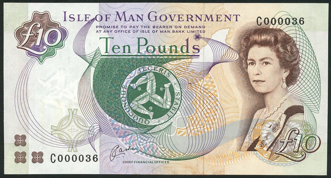 Isle of Man Government, £10 (3), ND (1991-), serial numbers C000036, C000064, C000093, signature Cashen, brown, green, violet and orange, portrait of Queen Elizabeth II by Anthony Buckley at right, triskeles at centre, promissory clause, "PAY AT...BANK LIMITED", reverse Peel Castle