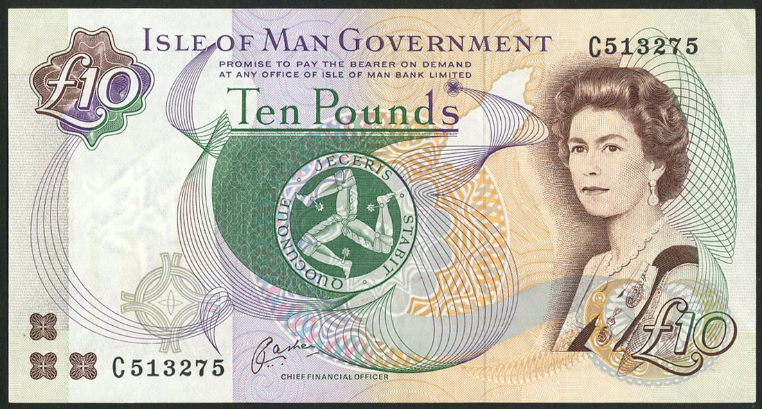 Isle of Man Government, £10 (5), ND (1991-), serial numbers C513275, C905003/04/05, C982948, signature Cashen, brown, green, violet and orange, portrait of Queen Elizabeth II by Anthony Buckley at right, triskeles at centre, promissory clause, "PAY AT...BANK LIMITED", reverse Peel Castle