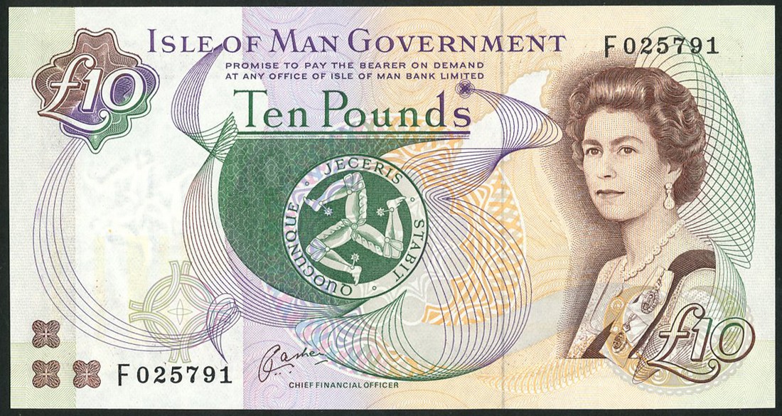 Isle of Man Government, £10 (4), ND (1991-), serial numbers D984578, F025791/92/93, signature Cashen, brown, green, violet and orange, portrait of Queen Elizabeth II by Anthony Buckley at right, triskeles at centre, promissory clause, "PAY AT...BANK LIMITED", reverse Peel Castle