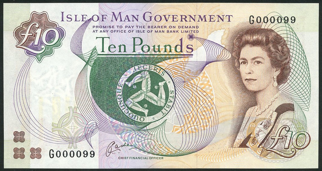 Isle of Man Government, £10 (5), ND (1991-), serial numbers G000099, G000341/42/43/44, signature Cashen, brown, green, violet and orange, portrait of Queen Elizabeth II by Anthony Buckley at right, triskeles at centre, promissory clause, "PAY AT...BANK LIMITED", reverse Peel Castle