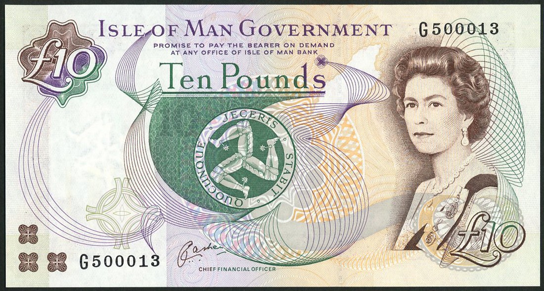 Isle of Man Government, £10 (4), ND (c.2000), serial numbers G500013, G500060, G500099, G999983, signature Cashen, brown, green, violet and orange, portrait of Queen Elizabeth II by Anthony Buckley at right, triskeles at centre, promissory clause, "PAY AT...BANK", reverse Peel Castle