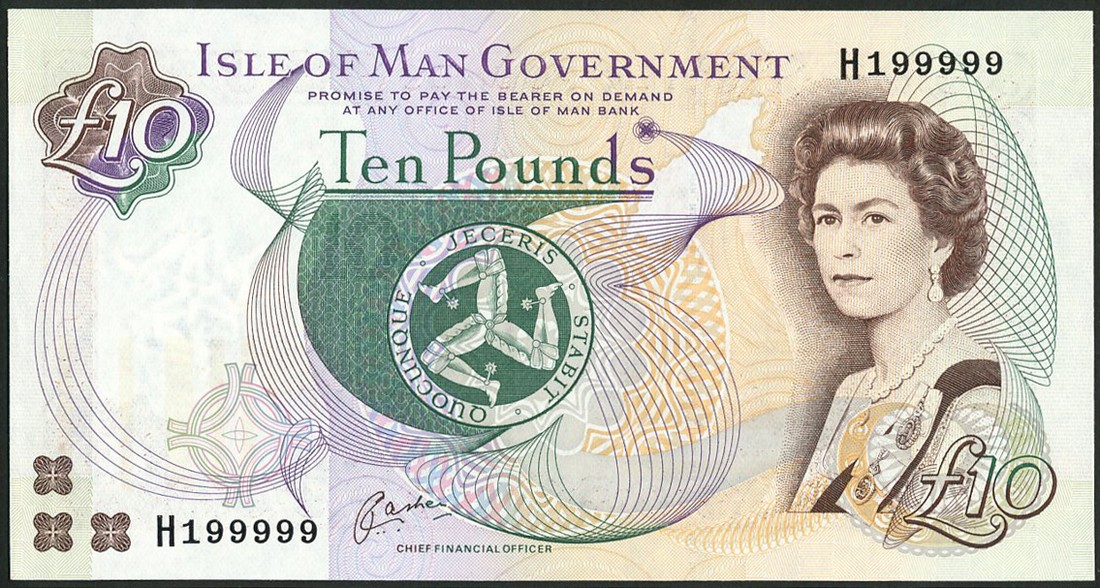 Isle of Man Government, £10 (6), ND (c.2000), serial numbers H199999, H200001, H300001, J400000, J400001, J500000, signature Cashen, brown, green, violet and orange, portrait of Queen Elizabeth II by Anthony Buckley at right, triskeles at centre, promissory clause, "PAY AT...BANK", reverse Peel Castle