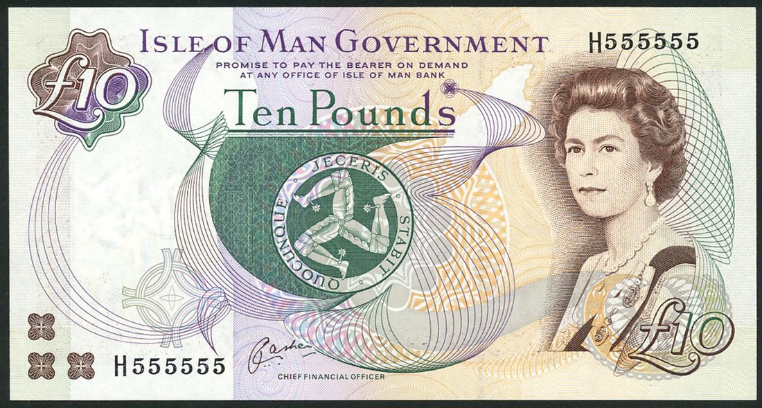 Isle of Man Government, £10 (2), ND (c.2000), serial numbers H555555, J777777, signature Cashen, brown, green, violet and orange, portrait of Queen Elizabeth II by Anthony Buckley at right, triskeles at centre, promissory clause, "PAY AT...BANK", reverse Peel Castle