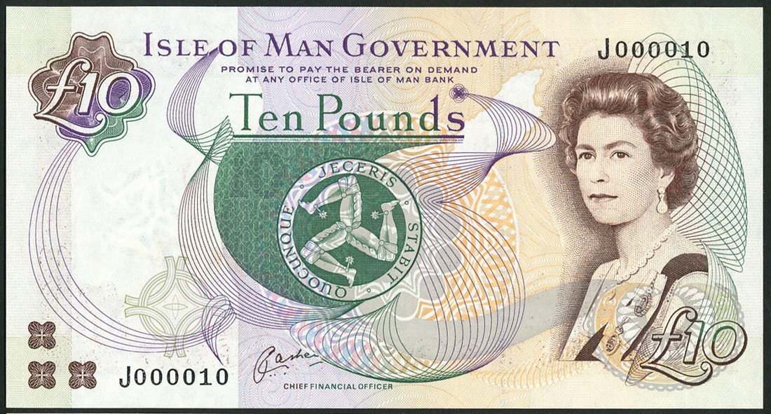 Isle of Man Government, £10 (7), ND (c.2000), serial numbers J000010, J000123 to J000128 inclusive, signature Cashen, brown, green, violet and orange, portrait of Queen Elizabeth II by Anthony Buckley at right, triskeles at centre, promissory clause, "PAY AT...BANK", reverse Peel Castle