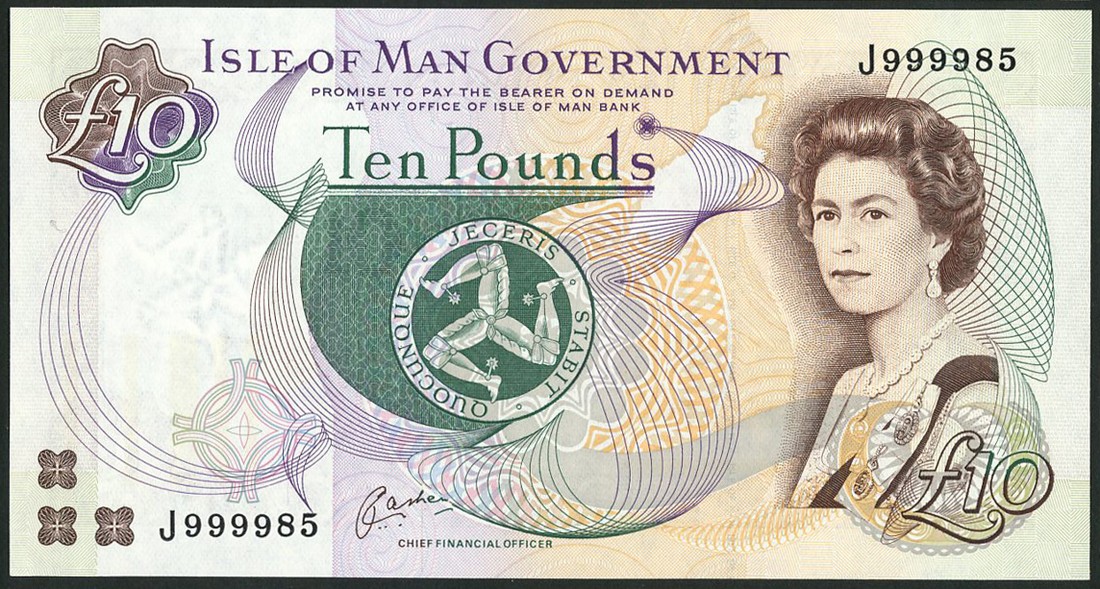 Isle of Man Government, £10 (6), ND (c.2000), serial numbers J999908, J999969, J999985, K000017/18/19, signature Cashen, brown, green, violet and orange, portrait of Queen Elizabeth II by Anthony Buckley at right, triskeles at centre, promissory clause, "PAY AT...BANK", reverse Peel Castle