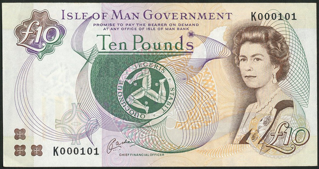 Isle of Man Government, £10 (7), ND (c.2000), serial numbers K000101/02/03, L000069/70/71/72, signature Cashen, brown, green, violet and orange, portrait of Queen Elizabeth II by Anthony Buckley at right, triskeles at centre, promissory clause, "PAY AT...BANK", reverse Peel Castle