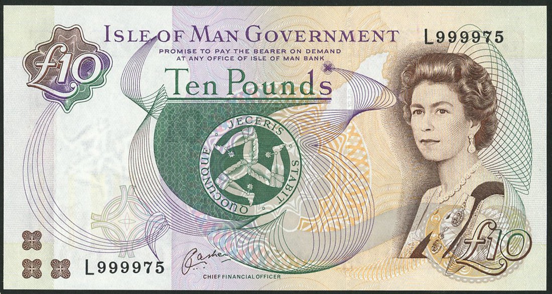 Isle of Man Government, £10 (6), ND (c.2000), serial numbers L999974 to L999979 inclusive, signature Cashen, brown, green, violet and orange, portrait of Queen Elizabeth II by Anthony Buckley at right, triskeles at centre, promissory clause, "PAY AT...BANK", reverse Peel Castle