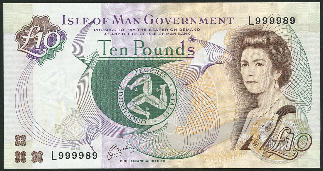 Isle of Man Government, £10 (6), ND (c.2000), serial numbers L999987/88/89, M000005/06/07, signature Cashen, brown, green, violet and orange, portrait of Queen Elizabeth II by Anthony Buckley at right, triskeles at centre, promissory clause, "PAY AT...BANK", reverse Peel Castle