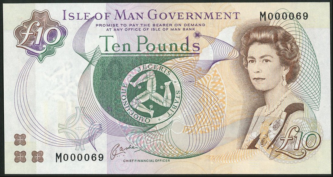Isle of Man Government, £10 (8), ND (c.2000), serial numbers M000069 to M000076 inclusive, signature Cashen, brown, green, violet and orange, portrait of Queen Elizabeth II by Anthony Buckley at right, triskeles at centre, promissory clause, "PAY AT...BANK", reverse Peel Castle