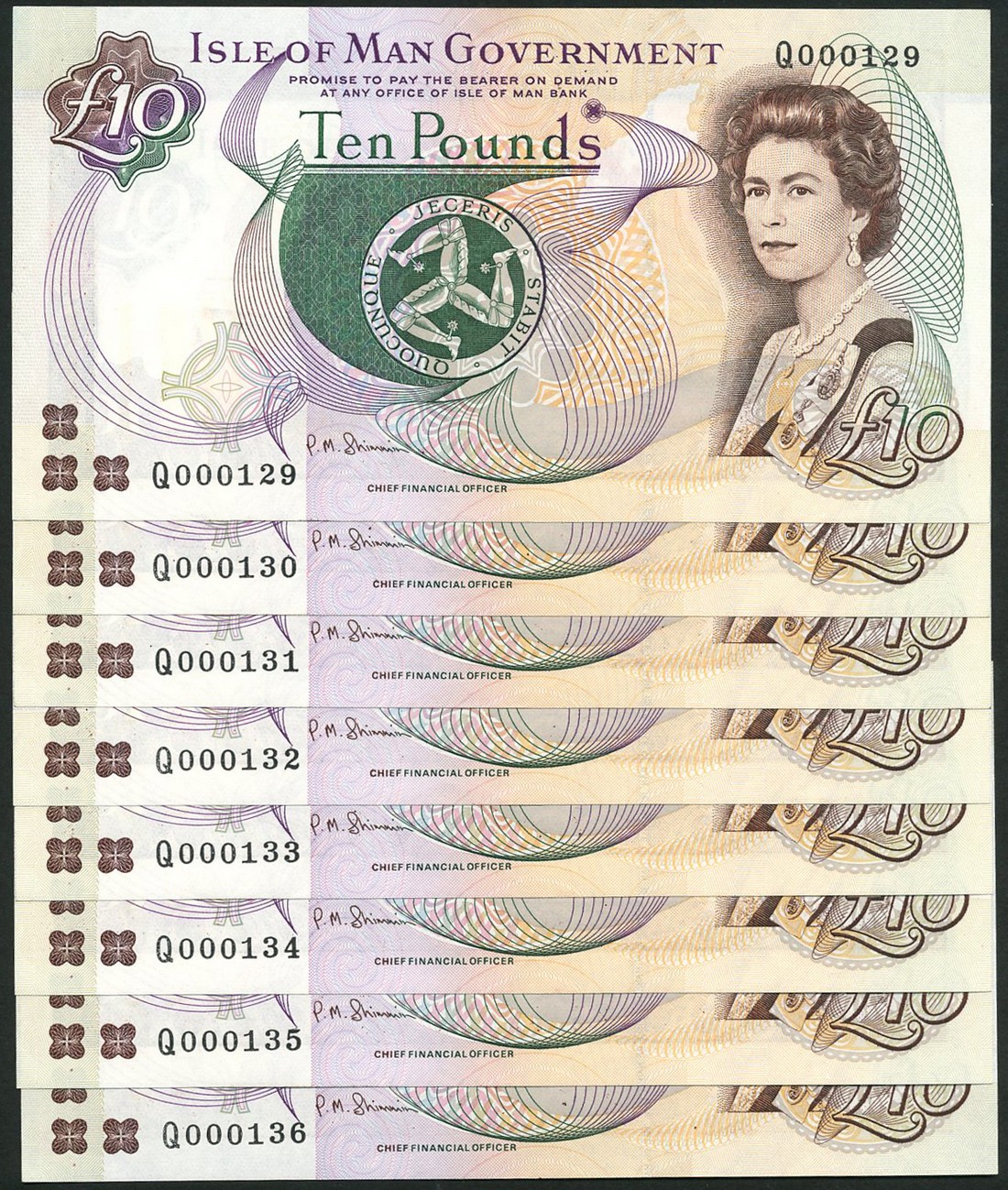Isle of Man Government, £10 (9), ND (2006-), serial numbers Q000128 to Q000136 inclusive, signature Shimmin, brown, green, violet and orange, portrait of Queen Elizabeth II by Anthony Buckley at right, triskeles at centre, promissory clause, "PAY AT...BANK", reverse Peel Castle