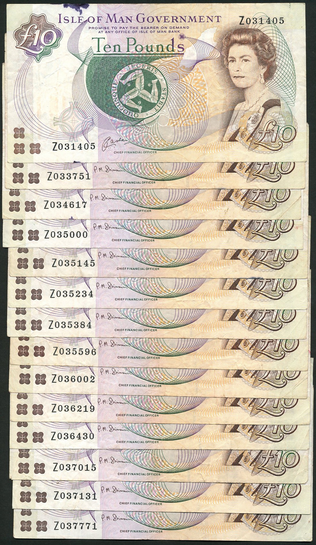 Isle of Man Government, £10, ND (c.2000), replacement prefix Z, signature Cashen; £10 (1), ND (2006-), replacement prefix Z (13), signature Shimmin, all brown, green, violet and orange, portrait of Queen Elizabeth II by Anthony Buckley at right, triskeles at centre, promissory clause, "PAY AT...BANK", reverse Peel Castle