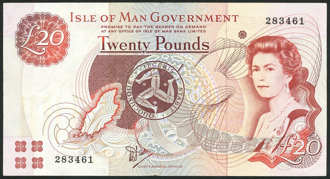 Isle of Man Government, £20 (2), ND (1991), serial numbers 271172, 283461, signature Dawson, red, brown and multicoloured, portrait of Queen Elizabeth II by Anthony Buckley at right, triskeles at centre, promissory clause, "PAY AT...BANK LIMITED", reverse inauguration of Laxey Wheel in 1854