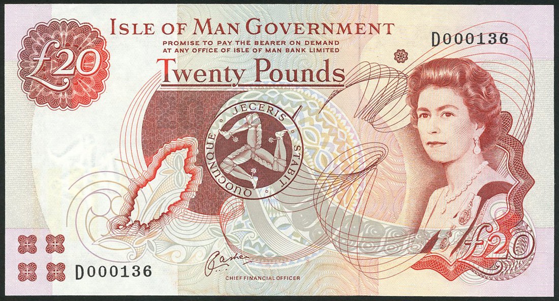 Isle of Man Government, £20, ND (1992-), serial number D000136, promissory clause, "PAY AT...BANK LIMITED"; also £20 (3), ND (2002), serial numbers E000031, E687001, F422389, promissory clause, "PAY AT…BANK", all signature Cashen, red, brown and multicoloured, portrait of Queen Elizabeth II by Anthony Buckley at right, triskeles at centre, reverse inauguration of Laxey Wheel in 1854