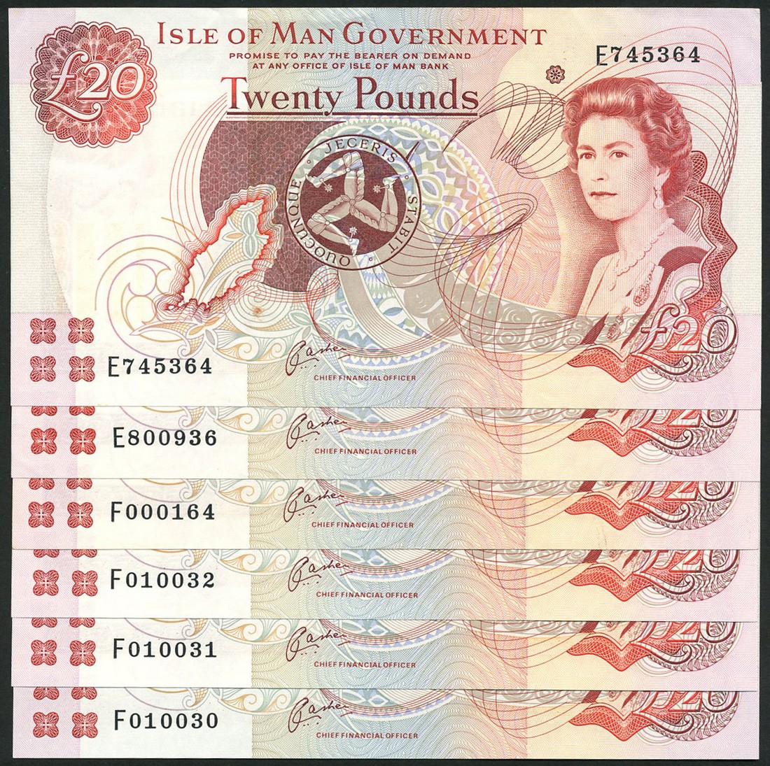 Isle of Man Government, £20 (7), ND (2002), serial numbers E610491, E745364, E800936, F000164, F010030/31/32, signature Cashen, red, brown and multicoloured, portrait of Queen Elizabeth II by Anthony Buckley at right, triskeles at centre, promissory clause, "PAY AT…BANK", reverse inauguration of Laxey Wheel in 1854