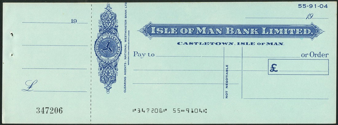 Isle of Man Banks, a group of unissued cheques with counterfoils, comprising Isle of Man Bank Limited (4), all different designs, one issued from Castletown, the remainder from Douglas; Martins Bank Limited (2), Douglas, one buff, one green,