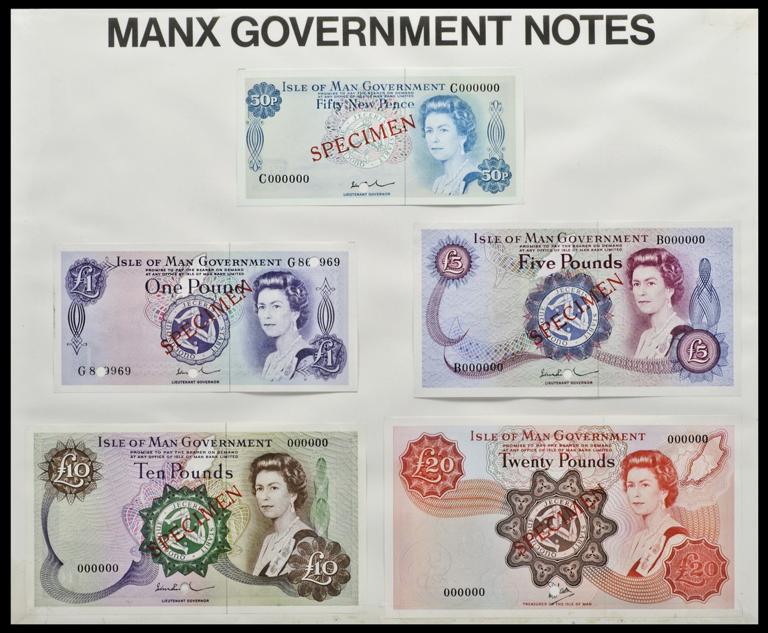 Isle of Man Government, framed specimen set entitled 'Manx Government Notes', showing the obverse of the 1972 issue of the 50p, turquoise, £1, purple, £5, blue and mauve, £10 brown and multicolour, all with John Paul signature, and £20, red, Dawson signature, all with Elizabeth II at right, red SPECIMEN overprints, cancellation holes