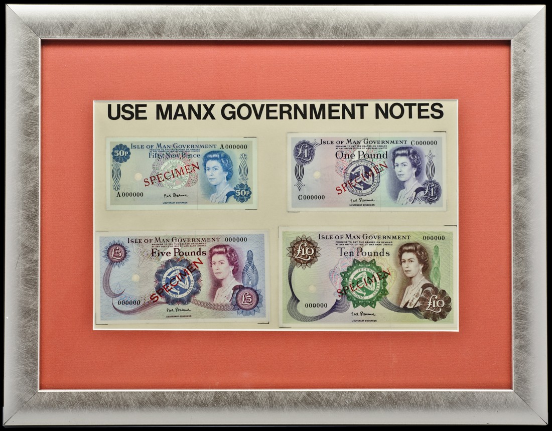 Isle of Man Government, framed specimen set entitled 'Manx Government Notes', showing the obverse of the 1972 issue of the 50p, turquoise, £1, green, £5, blue and mauve, £10 brown and multicolour, £20, red, and £50, grey and green, all with Dawson signature, Elizabeth II at right, red SPECIMEN overprints, cancellation holes