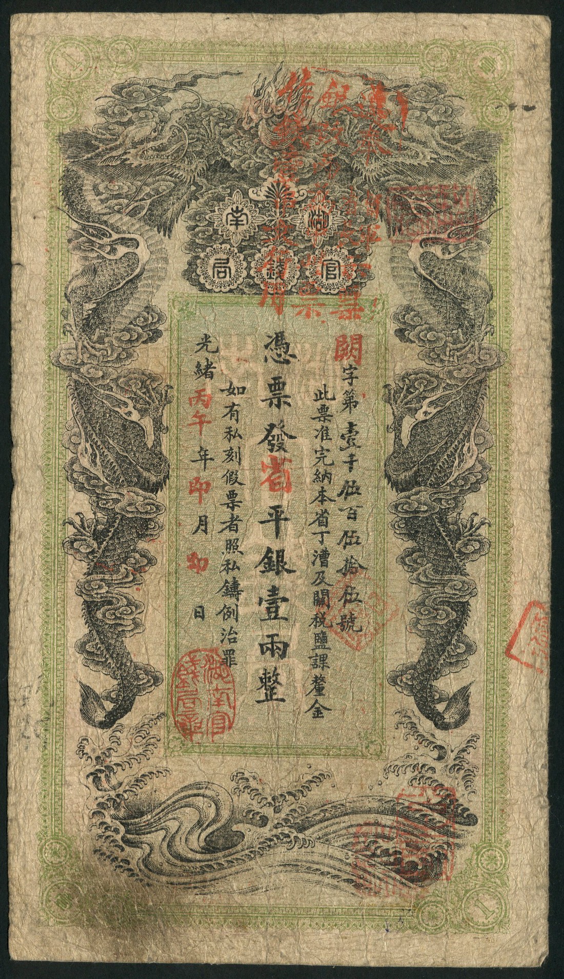 Hunan Government Bank, 1 tael, 1906, black and pale green, dragon top left and right, reverse text and large red seal