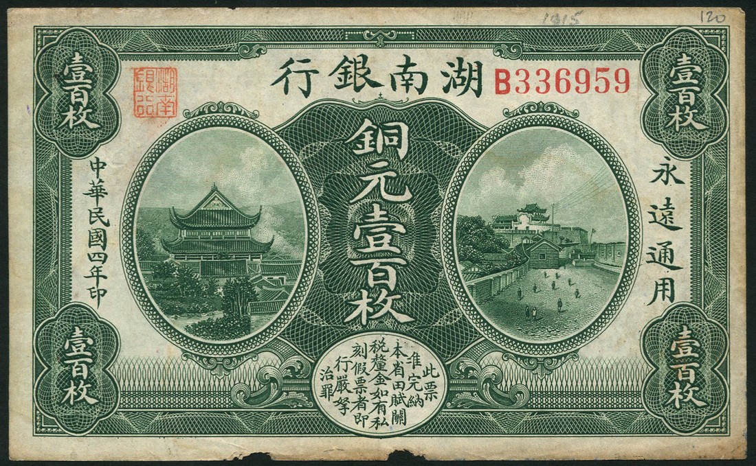 Hunan Provincial Bank, 100 coppers 1915, 10 coppers 1917 and 30 coppers 1917, green, blue and green respectively, similar designs with village road scene at right and Chinese house at left