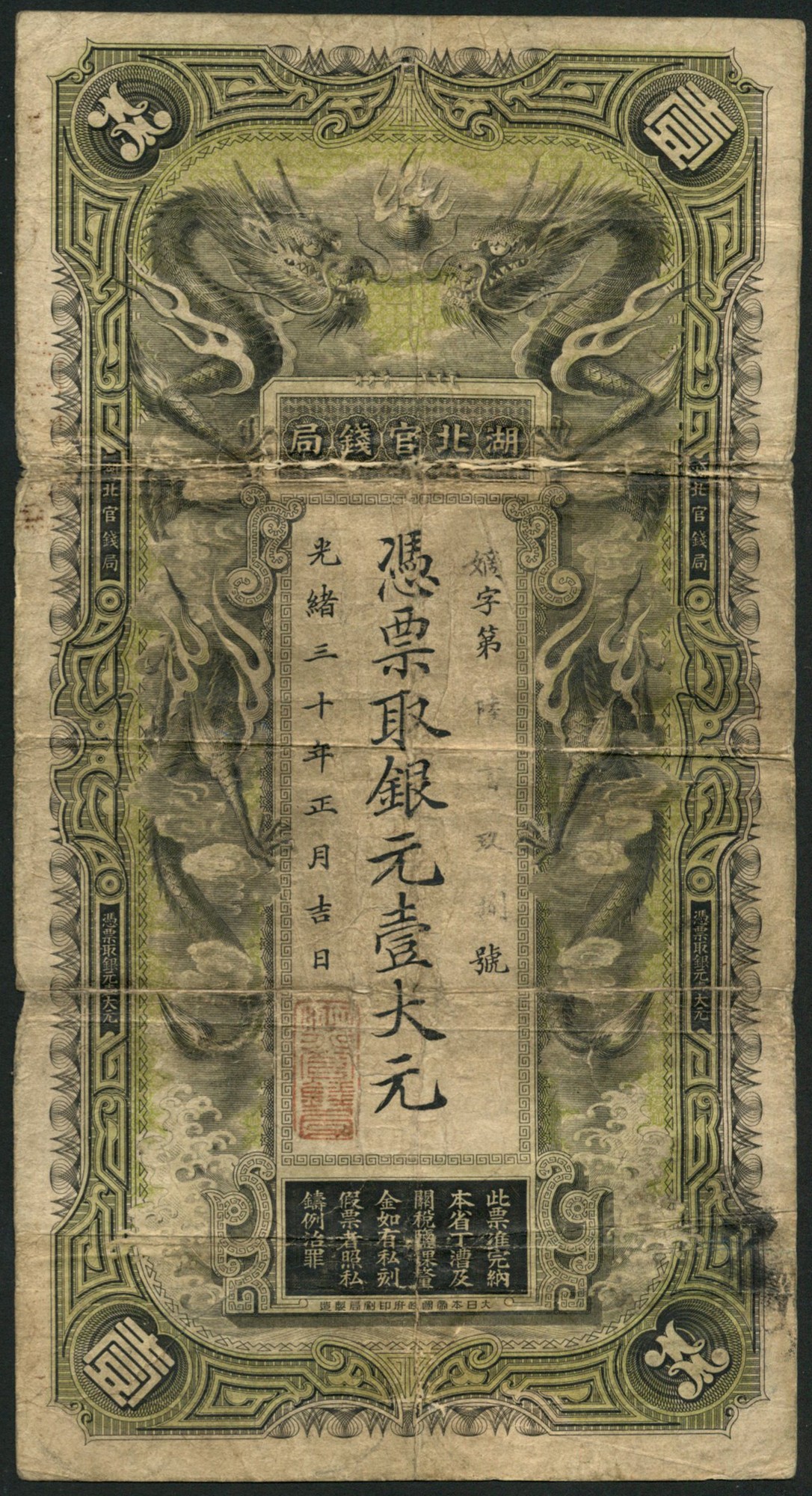 Hupeh Government Cash Bank, 1 ch'uan, 1906, black and green, dragon top left and right, reverse pale brown text in field