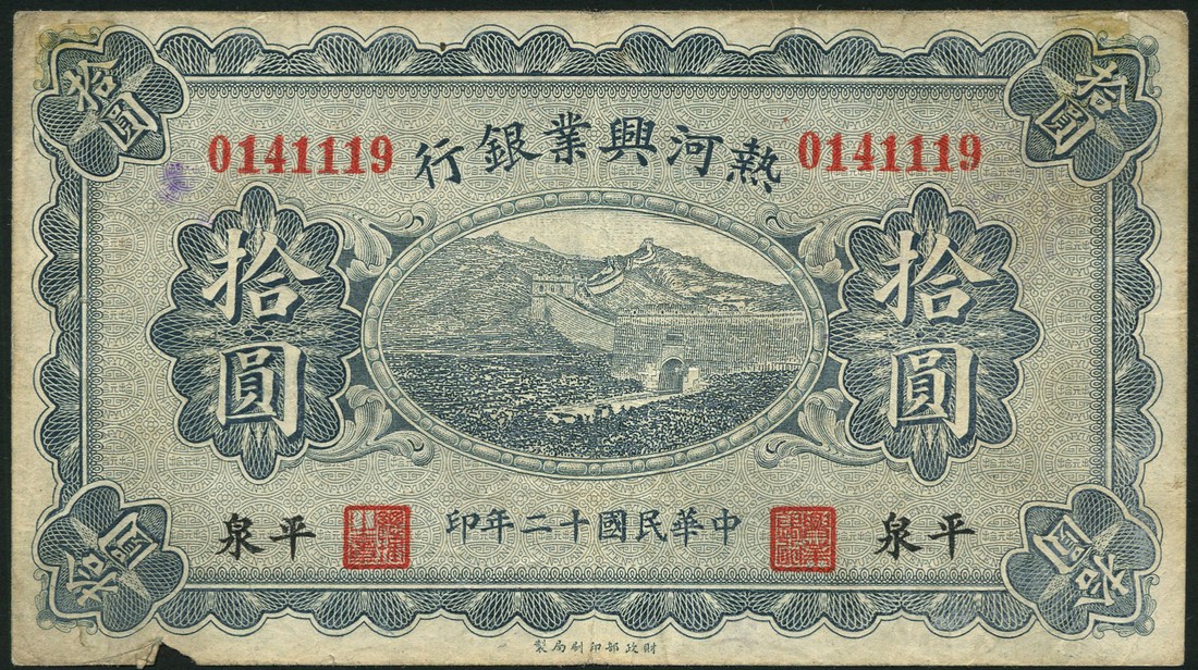 The Industrial Development Bank of Jehol, 5 yuan, 10 yuan, Pingchuan, 1923, red serial numbers, Great Wall on obverse, value in vignette on reverse