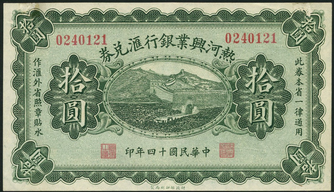The Industrial Development Bank of Jehol, 1, 5, and 10 yuan, 1925, violet, yellow and green respectively