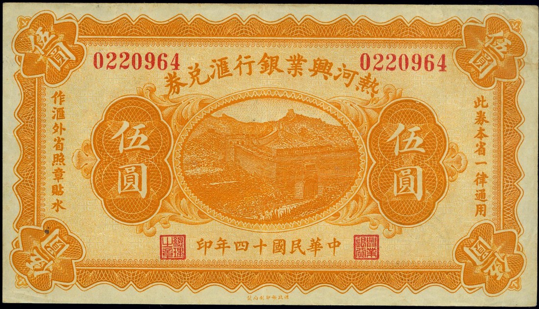 The Industrial Development Bank of Jehol, 5 yuan, 1925, serial number 0220964, yellow, Great Wall at centre, signature seals at bottom, reverse yellow, vignette with value at centre