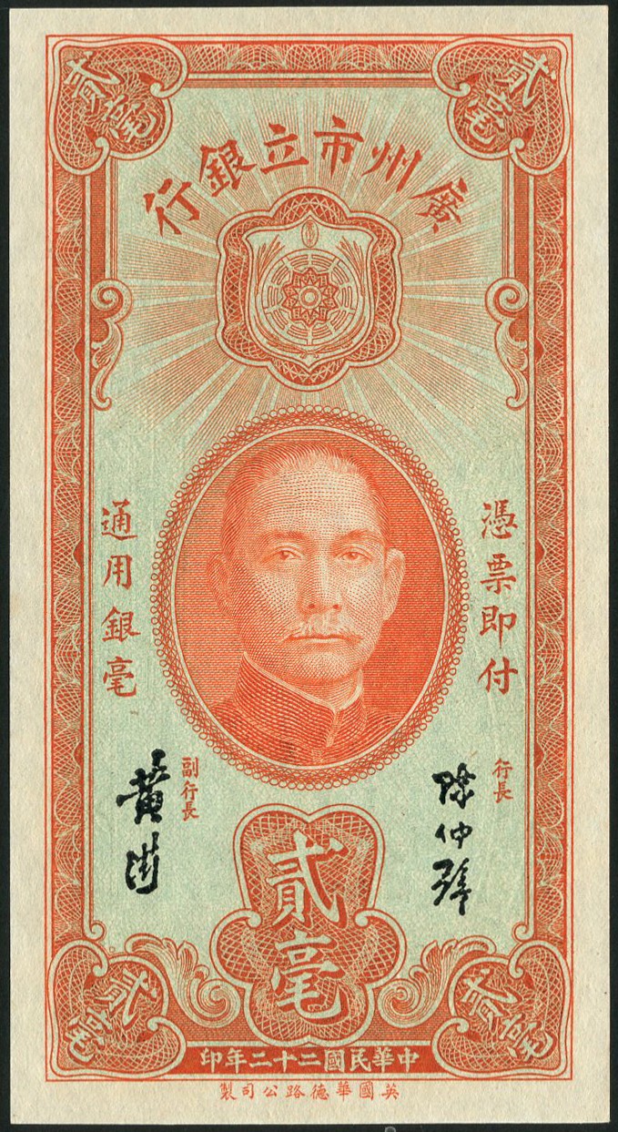 Canton Municipal Bank, 10 and 20 cents, 1933, Sun Yat Sen portrait at centre