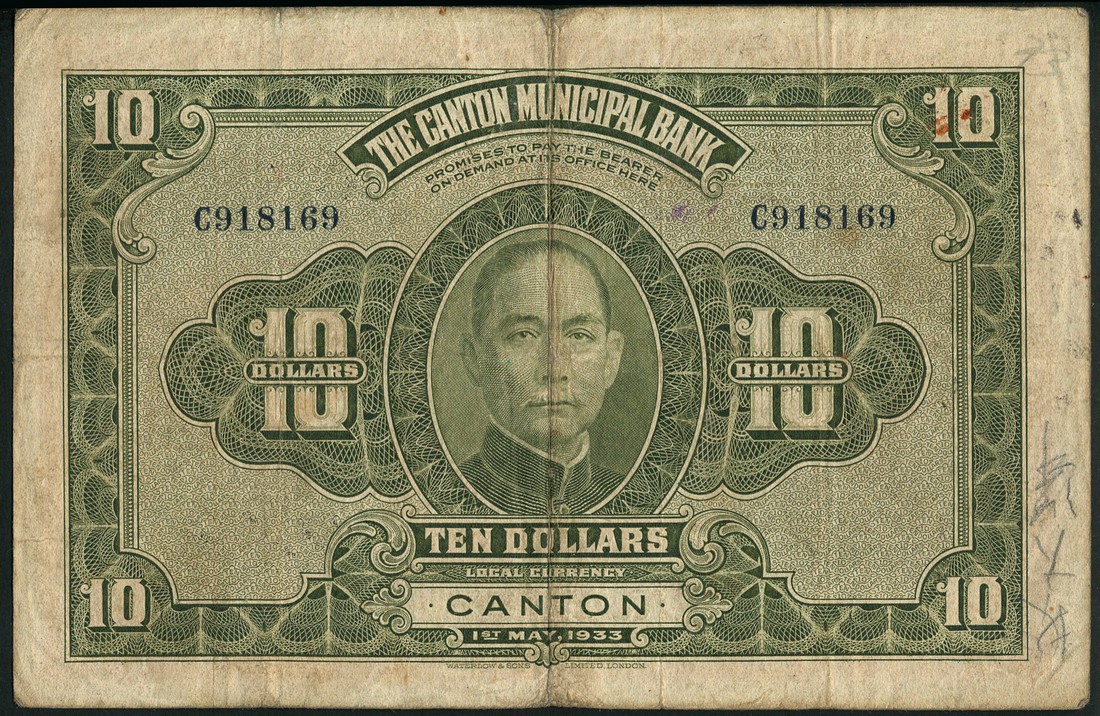 Canton Municipal Bank, $1, $5 and $10, 1933, blue serial numbers on reverse, vertical format, Sun Yat Sen Memorial, Zhenhailou and Sun Yat Sen Memorial Hall respectively