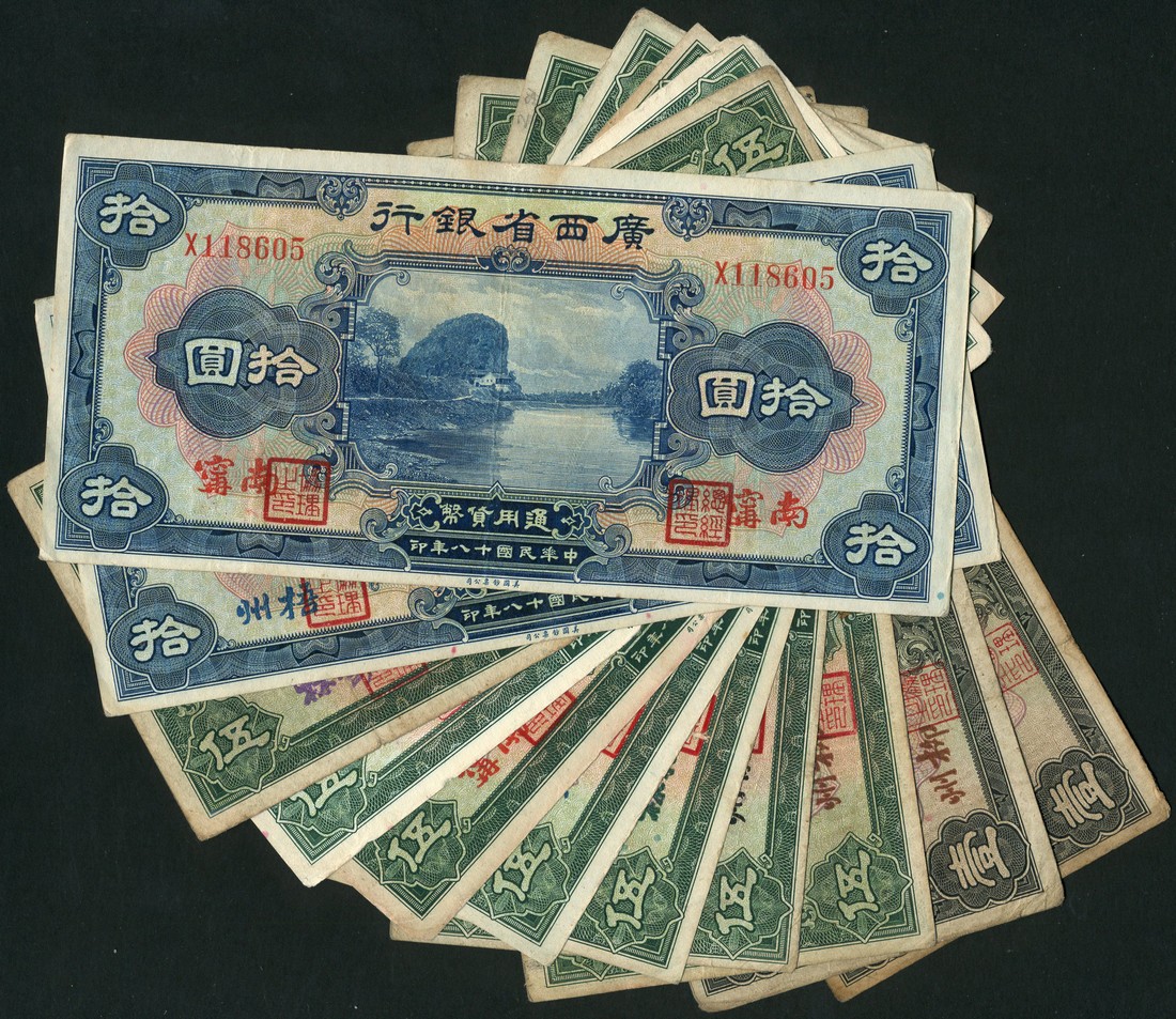 Provincial Bank of Kwangsi, 11 notes from the 1929 series, 1 yuan (2), 5 yuan (7) and 10 yuan (2), similar designs with Guilin mountains at centre, all different places of issue