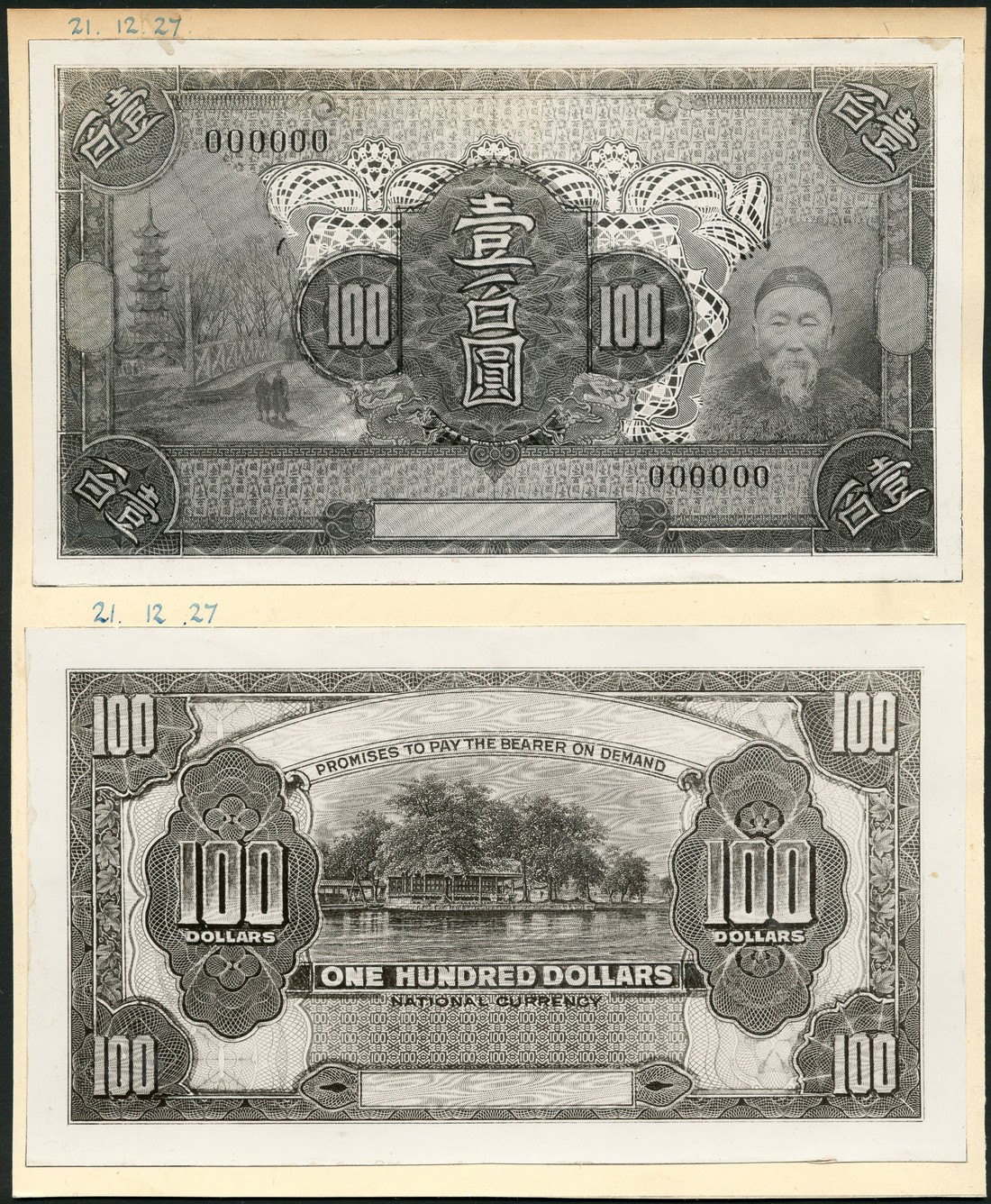 Pei Yang Tientsin Bank/Kiangsu Bank, an obverse and reverse photograph mounted on card for a proposed issue of $100, ND (ca 1927), pagoda and park at left (Chekiang Bank), old man in cap at right (Pei Yang Tientsin, Pei Yang Kin-Fu Bank for 'old man'), reverse water and bridge, value at left and right