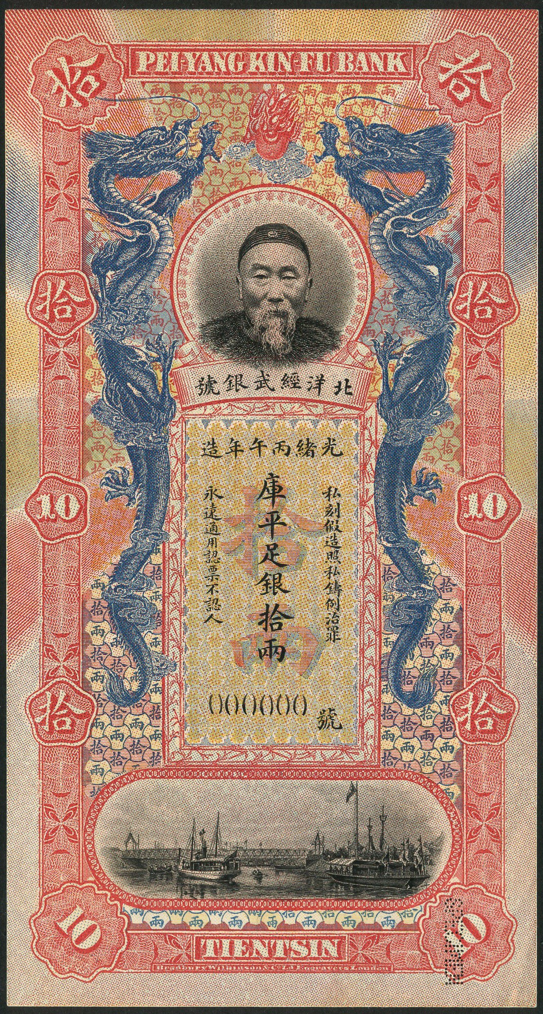 Pei Yang Kin Fu Bank, specimen 10 taels, ND (1906/1910), zero serial numbers, blue, red and orange and ochre, Li Hung Chang top centre, boats low centre, dragon in green at left and right, reverse pale blue and pale red-orange, text at centre