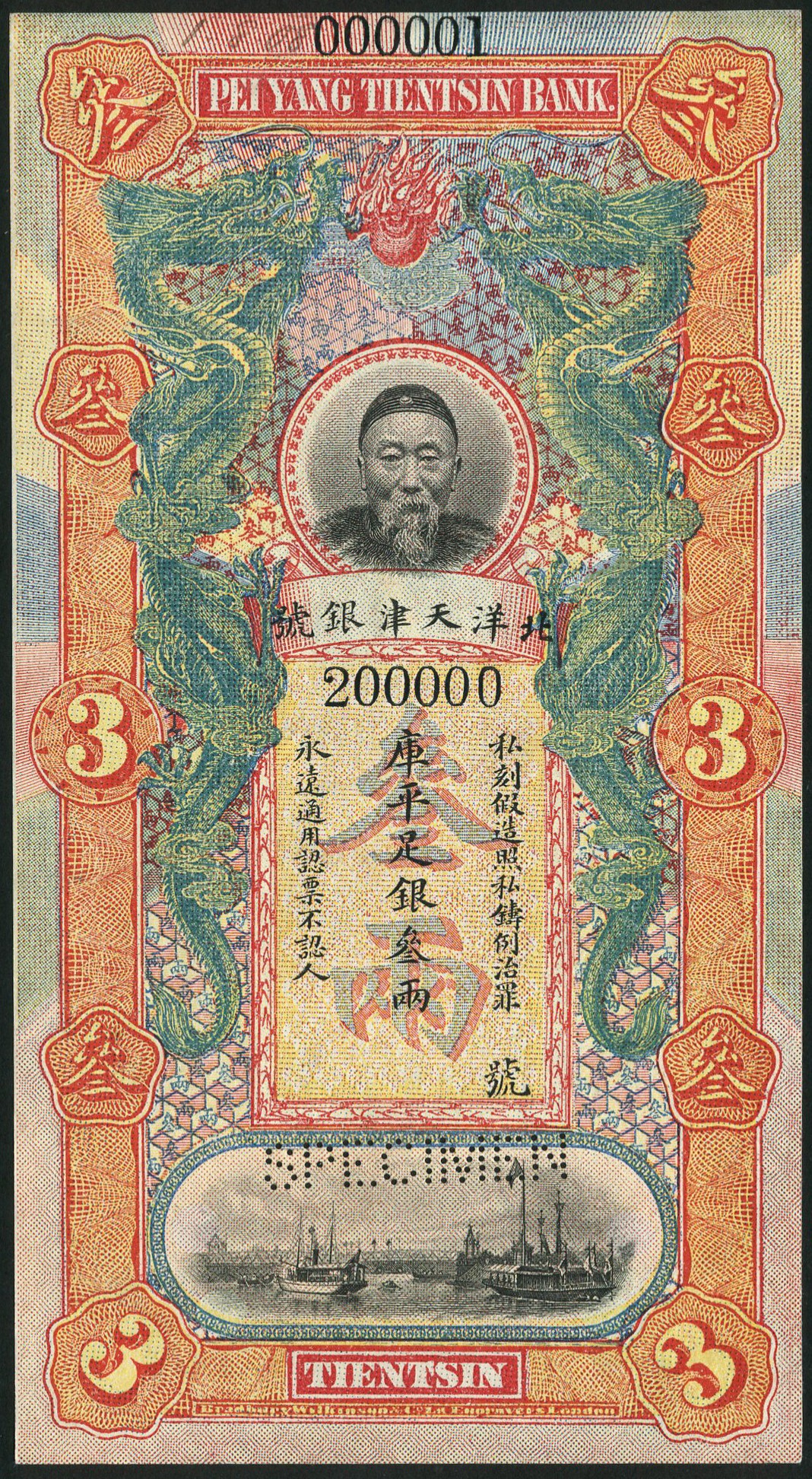 Pei Yang Tientsin Bank, specimen 3 taels, ND (1906/1910), serial number 000001-200000, orange, green and multicoloured, Li Hung Chang top centre, boats low centre, dragon in red at left and right, reverse pale red and green, text at centre