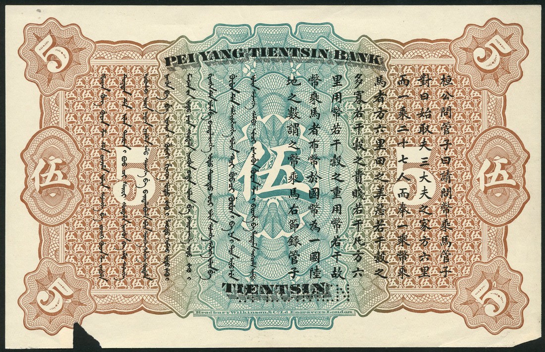 Pei Yang Tientsin Bank, a uniface reverse proof for a $5, Tientsin, ND, type of 1910, brown and pale blue, text and value