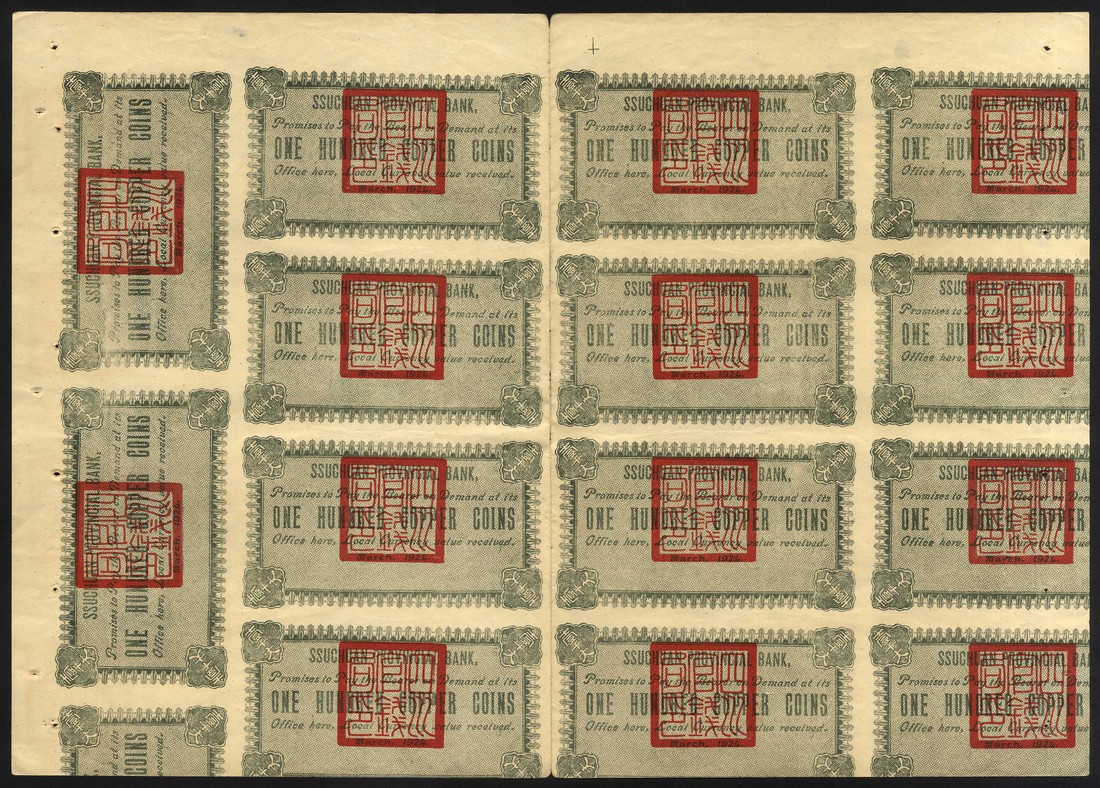 Szechuan Provincial Bank, a sheet of 14 unissued 100 copper coins, March 1924, green, pagoda at left and right reverse green, red seal on face