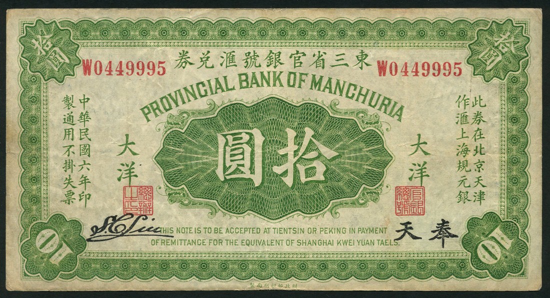 Provincial Bank of Manchuria, $10, 1917, red serial number W 0449995, green and white, reverse blue, the Temple of Heaven at centre