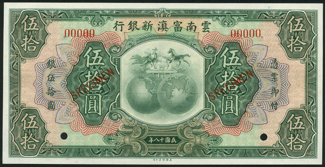The New Fu-Tien Bank, a specimen set comprising $1,5,10,50 and $100, 1929, all red serial number 00000, all phoenix and horse above conjoined globes at centre