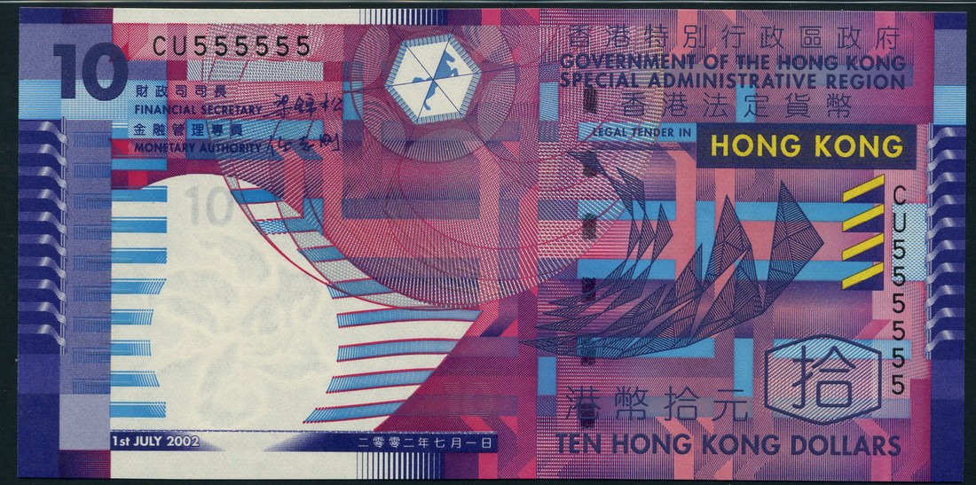 Government of Hong Kong, 10 dollars, 2002, serial number CU555555, multicoloured abstract design,