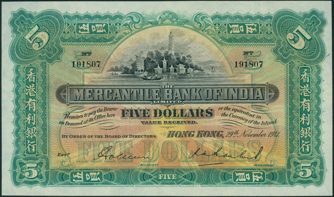 Mercantile Bank of India Limited, $5, Hong Kong, 29 November 1941, serial number 191807, green, pale orange and red, pagodas on island top centre, two printed signatures below, value at centre and at each corner, reverse red, head of Mercury at centre with bank title, value at left and right and serial number low left and right